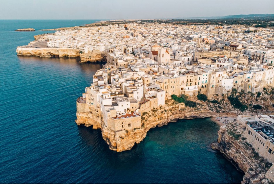 Next we’ll continue to Polignano a Mare where we’ll explore the charming town with a local guide, wandering through its narrow streets and enjoying stunning views of the Adriatic from the cliffside. Discover its iconic whitewashed buildings, beautiful beaches, and vibrant piazzas, all while soaking in the town’s relaxed, picturesque atmosphere. Immerse yourself in the unique atmosphere of one of Puglia’s most charming towns. Overlooking the spectacular cliffs that plunge into the Adriatic Sea, you can enjoy a selection of local specialties: fragrant Puglian focaccia, artisanal taralli, regional cheeses and cured meats, accompanied by olives, traditional preserves, and seasonal delicacies. All of this is perfectly complemented by a glass of local wine or a refreshing spritz, ideal for toasting at sunset.